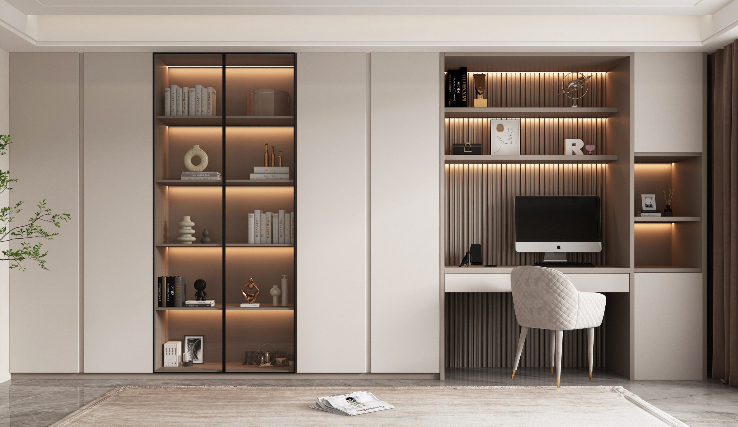 A space-saving floor-to-ceiling bookshelf with modular shelves accommodates large book collections. Solid wood frames and anti-tip brackets ensure stability. Customizable glass doors or LED lighting options add elegance while protecting books from dust, perfect for home libraries, living rooms, or educational institutions.